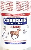 Cosequin Optimized with MSM contains higher levels of active ingredients, now with double the glucosamine hydrochloride, at 14,400 mg and 2,400 mg of chondroitin sulfate (per 2 scoops), as compared to the original researched formula and is formulated as a tasty powder. This fortifying of ingredients in Cosequin Optimized stems from current research suggesting that those horses under high stress from intense activity may benefit from higher levels of glucosamine. It also has the addition of high purity MSM, or methylsulfonylmethane. MSM is an organic source of sulfur, a compound used by cartilage. Some veterinarians suggest using MSM to help manage joint health. Cosequin Optimized with MSM for horses contains 10,000 mg MSM per 2 scoops. Dosage: For 600 lb horses and over: feed 2 scoops daily for 2 to 4 weeks, then 1 scoop daily for long term administration. This 1,400 gram container is a 84 day supply. Apple flavored.