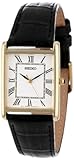 The stylish and classic Seiko Men's Dress Black Leather Strap Watch features a black leather strap with buckle clasp and is emphasized by a gold tone case. The rectangular white dial features black hands and Roman numerals designed for timeless appeal. Cabochon Crown. 30 meters water resistant.