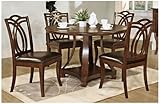 This classic table design features solid wood construction with a cherry wood finish and decorative details on the back of the chairs. A five piece dining set, it comes complete with a round table and four matching solid wood chairs with near black faux leather seats. Round table is 48" round.