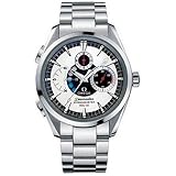 Take command of the seas with Omega's Aqua Terra NZL-32 automatic chronograph watch for men, which features a regatta countdown timer at its center. This stylish watch has a large, round rhodium-plated watch case that measures 42.4mm wide (1.66 inches) that's matched to a classic triple-link stainless steel bracelet band. The contemporary dial has a silver-colored center that's framed by a black exterior ring with small second indexes, and it also includes dagger-style hour markers and luminous-tipped skeleton hands (with seconds hand). Other features include a 44-hour power reserve, scratch-resistant and glare-proofed domed sapphire crystal, and water resistance to 150 meters (500 feet)--suitable for swimming, snorkeling, and light recreational diving.